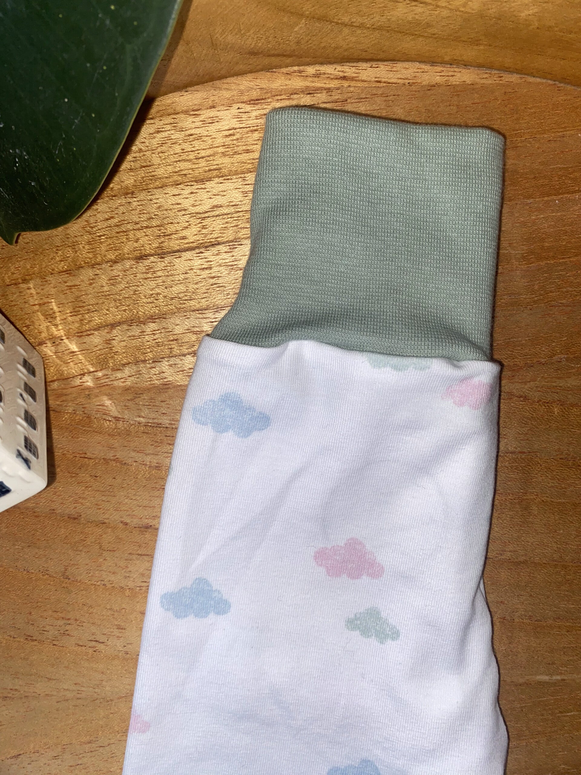 Deze vrolijke unisex baby legging met speelse wolkjesprint in zachte tinten groen, roze en blauw is met zorg handgemaakt van rekbare stof. De comfortabele boord sluit mooi aan zonder te knellen, zodat je kleintje vrij kan bewegen en spelen.