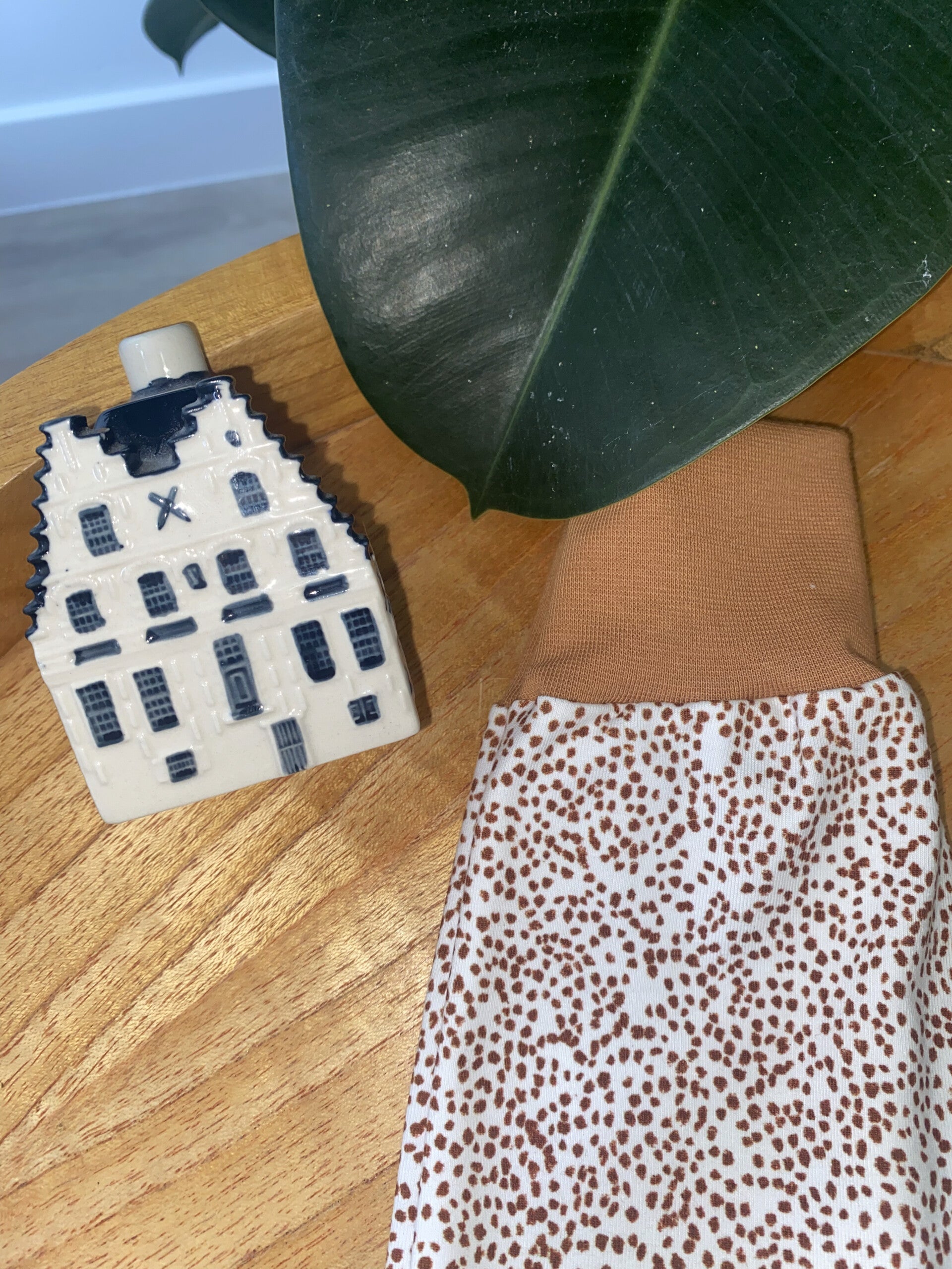 Een vrolijke en comfortabele legging met een speelse spikkelprint in roestbruine tinten op een crème ondergrond. De tailleband is gemaakt van zachte, rekbare boordstof in warm cognacbruin, waardoor de legging fijn aansluit en niet knelt. Ideaal voor de herfst en winter: stijlvol én praktisch om in te bewegen en spelen.