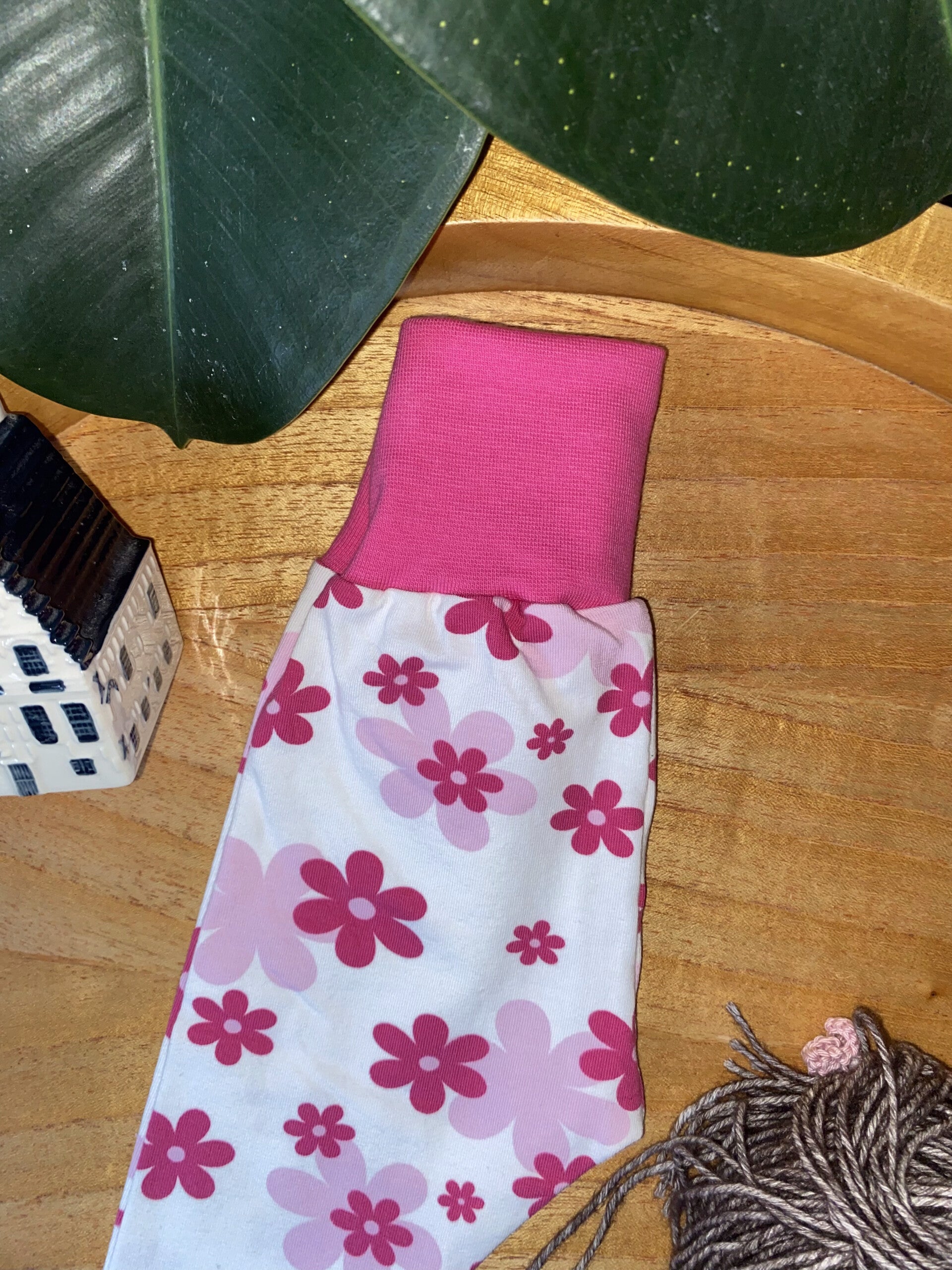 Deze handgemaakte baby legging brengt meteen een vrolijke touch in de kledingkast van je kleintje! De stof is zacht, rekbaar en comfortabel, waardoor je kindje vrij kan bewegen tijdens het spelen, kruipen en slapen. De brede roze boord zorgt voor een fijne pasvorm die niet knelt en makkelijk aan- en uit te trekken is.