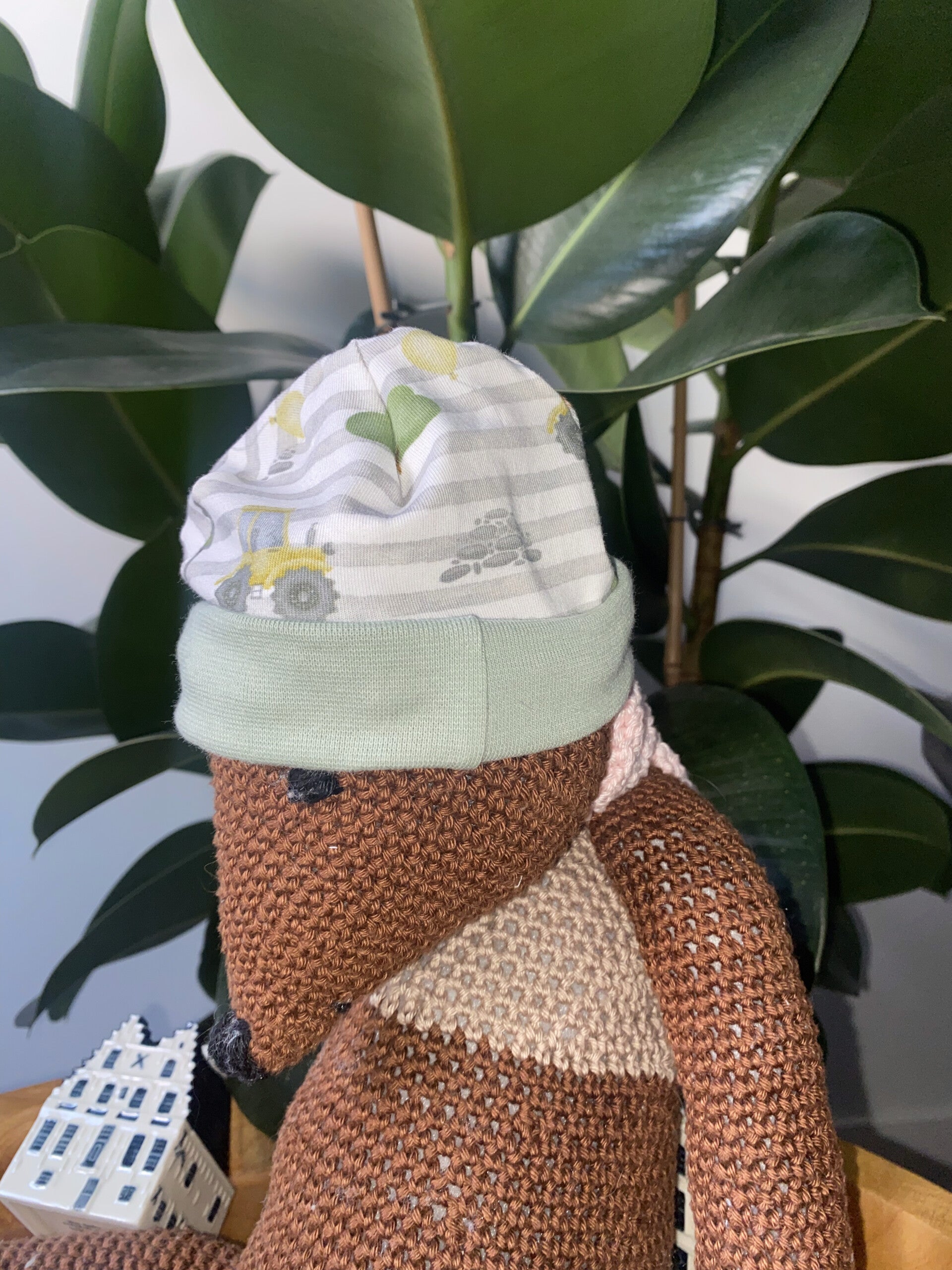 Deze handgemaakte newborn beanie is speciaal gemaakt voor de allerkleinsten. Het zachte en rekbare stofje zorgt voor een fijne pasvorm en houdt het hoofdje van je baby lekker warm. Het stoere tractorprintje maakt dit mutsje extra vrolijk en uniek – perfect als eerste accessoire voor je pasgeboren kindje.