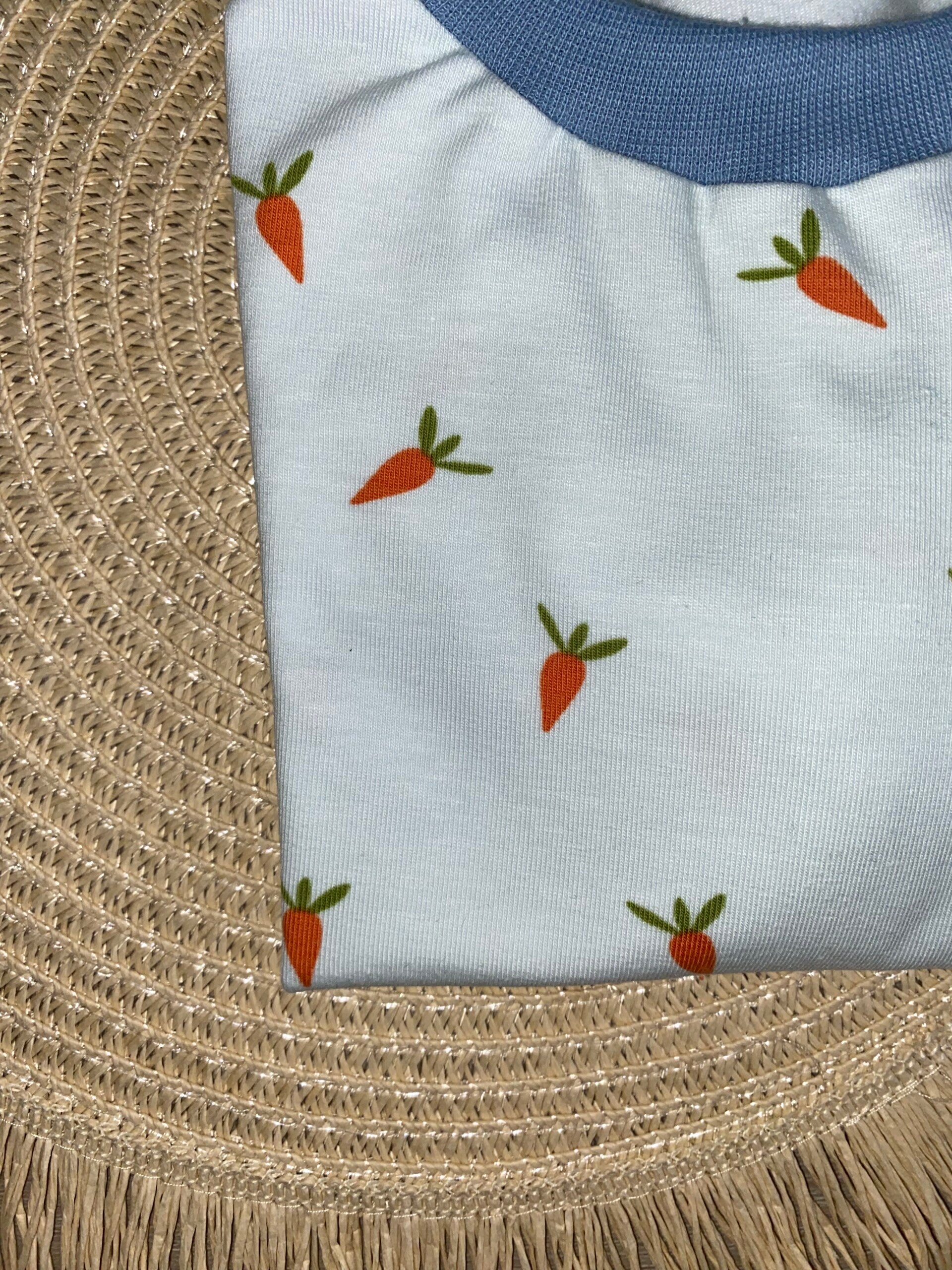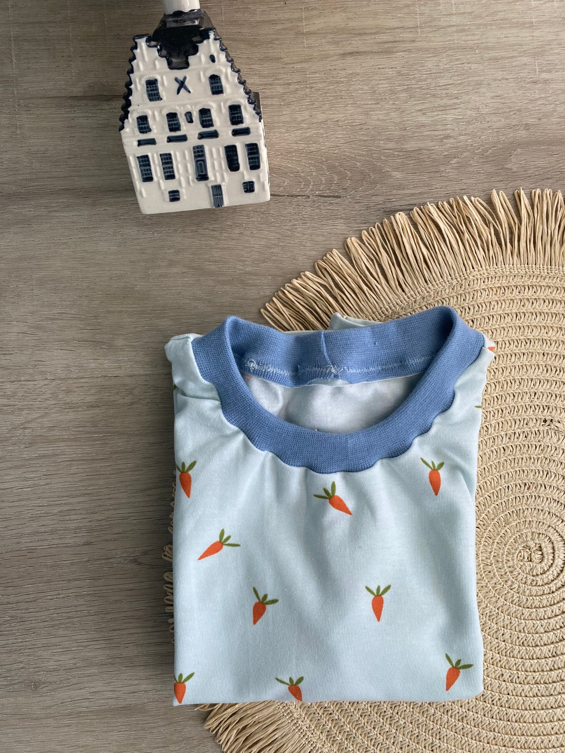 Een handgemaakt shirtje dat zowel praktisch als stijlvol is – perfect voor kleine avonturiers! 🥕💙